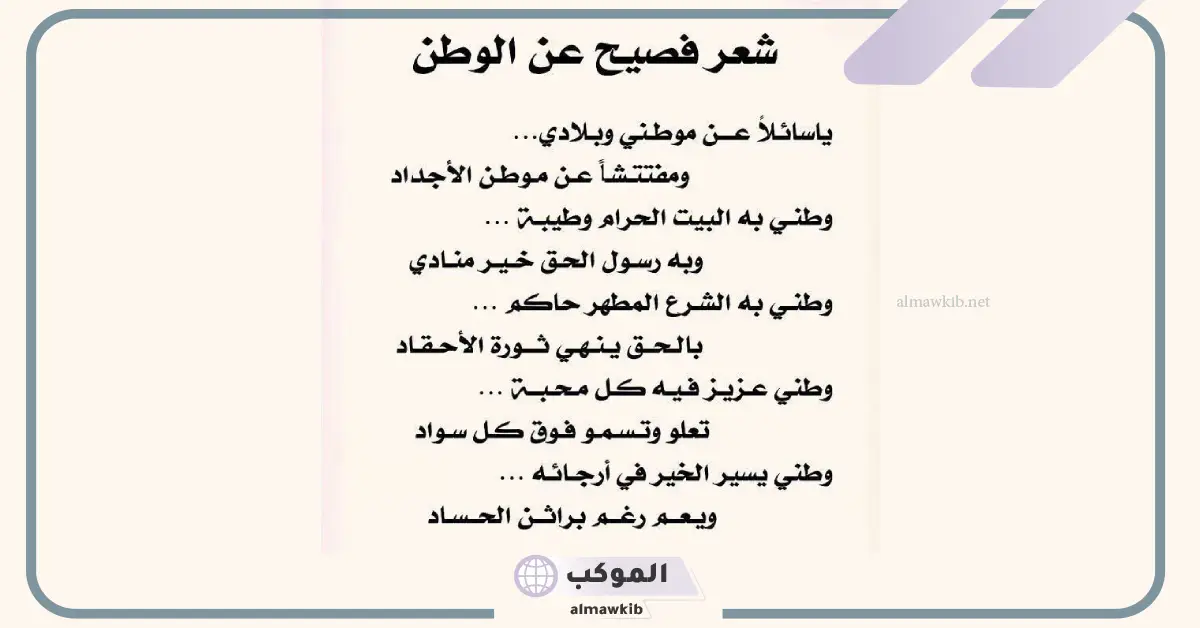 قصيدة باللغة العربية الفصحى عن الوطن هي أجمل ما يمكن إلقاؤه في الإذاعة المدرسية أو ندوةٍ عن الوطن الحبيب، وقد برع الشعراء منذ القدم في التعبير عن حب الوطن والحنين إليه في أشعارهم، ومن خلال الموضوع التالي نعرض قصيدة باللغة العربية الفصحى عن الوطن مع أحلى الكلمات والعبارات التي قيلت في الأوطان.
