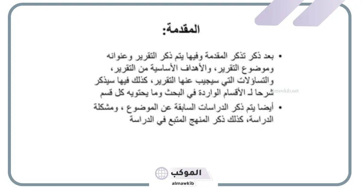 - قد تأتي المقدمة بعد صفحة العنوان والاسم وصفحة التمهيد لدراسة التقرير والإهداء.